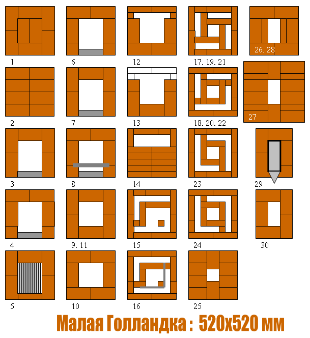 Не будем останавливаться на разборе порядовок, схемы подробно демонстрируют кладку. Только заметим, что в 21-ом ряду перекрытие засыпают песком и колотым кирпичом, чтобы увеличить теплоотдачу сооружения.