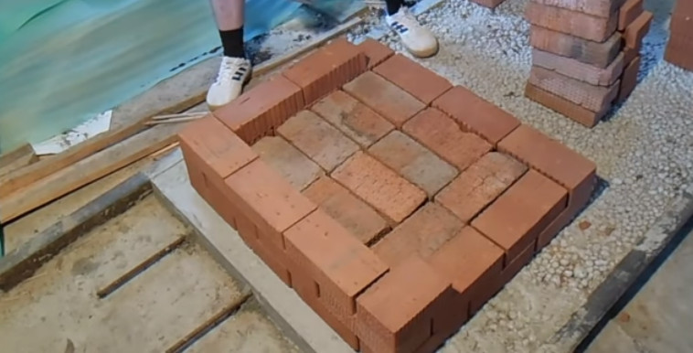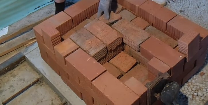 Стартовый 1-ый ряд выкладывают сплошным, для его сооружения вообще рекомендовано использовать цементный или известковый раствор. Следующие три ряда с 2-го по 4ый строят в виде колодца, но с отверстием для подпечья, расположенного с лицевой стороны. В каждом ряду кирпич кладут с перевязкой, т.е. с разбежкой швов.