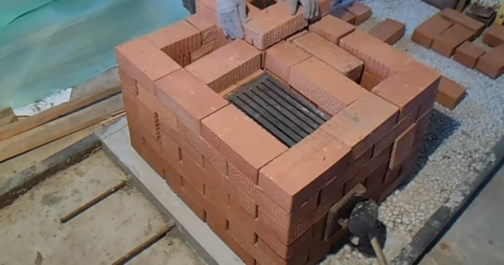 В 5-ом ряду начинается закладка свода, который ставят на устроенную из доски или обрезков фанеры фигурную опалубку. Для опоры элементов у кирпичей стесывают пятки. Затем два ряда 6 и 7 кладут с перевязкой, одновременно с тем возводят свод. Во время сооружения 8-го ряда свод замыкают.