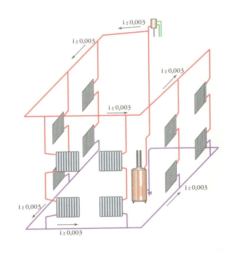 При нагреве или охлаждении плотность воды меняется. Горячая поднимается по стояку, перетекает к радиаторам по магистралям. Важно сделать маленький уклон в 3-5 градусов при укладке горизонтальных труб к батареям.