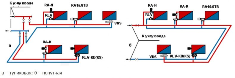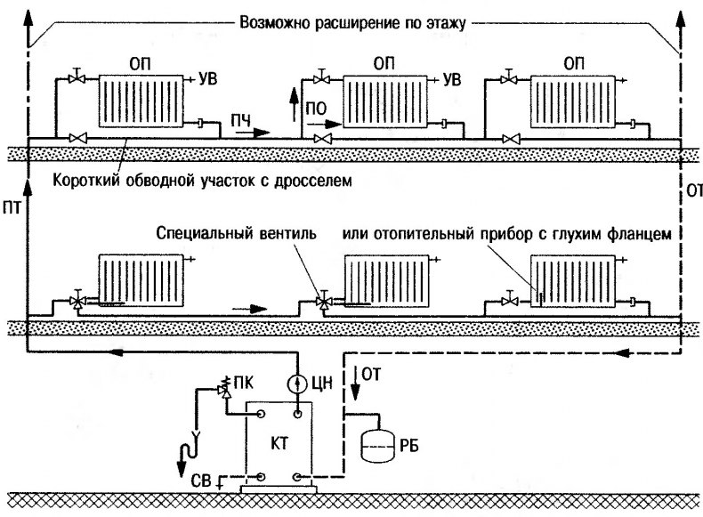 Такой метод разводки надежно работает только при хорошем давлении воды в системе, поэтому его не используют при естественной циркуляции.