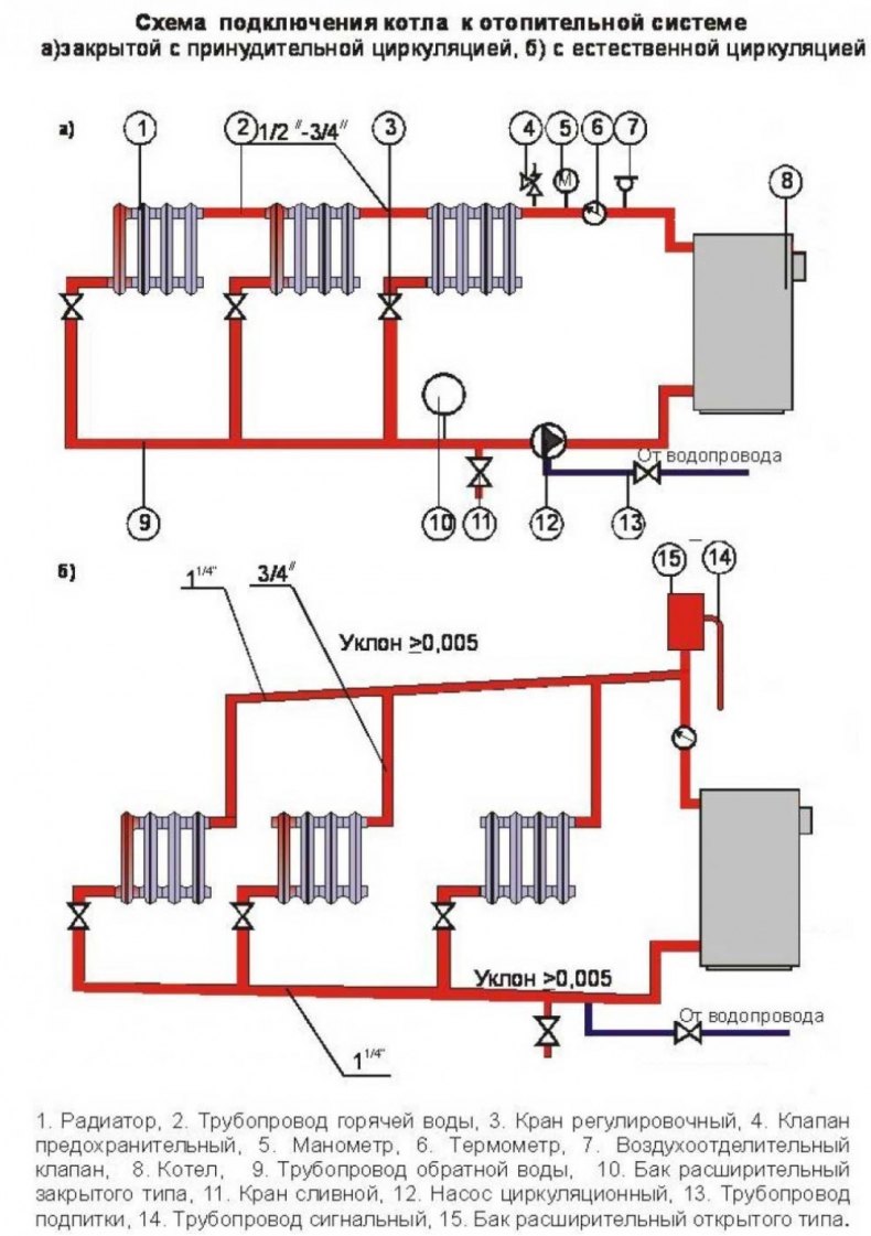 Для начала давайте рассмотрим принцип отопления. Любой вид отопительной системы является замкнутым. В простом варианте любая схема разводки может быть рассмотрена как кольцо, состоящее из труб. В нем циркулирует горячая жидкость от нагревательного котла в приборы отопления, находясь в них какое-то время. Теплоноситель отдаёт при циркуляции тепловую энергию, и вновь направляется внутрь котла для нагрева. Цикл периодически повторяется.