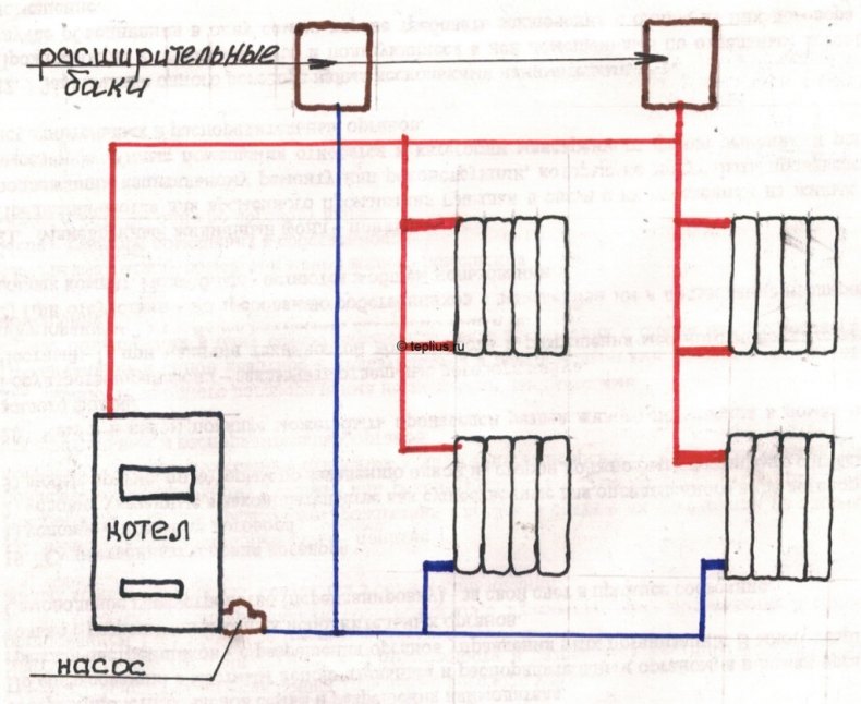 Эта двухтрубная схема очень похожа на предыдущую, только здесь предусматривается установка расширительного бачка в самой верхней части системы, например, на утепленном чердаке или под потолком. Оттуда теплоноситель спускается к радиаторам, отдает им часть своего тепла, после чего отправляется через обратную трубу в отопительный котел.