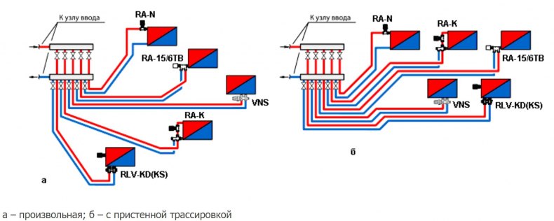 Лучевая разводка предполагает подключение каждого отопительного прибора (или небольшой их группы) непосредственно к распределительному коллектору, раздающему горячую и собирающему охлажденную воду