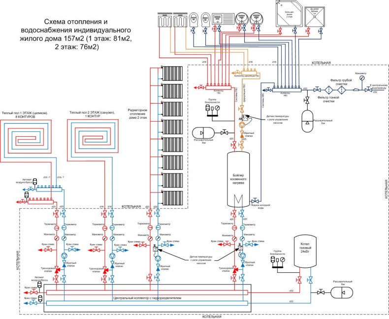 Если нужно много контуров, например, теплый пол, бойлер, аранжерея, гараж, собачья будка, еще и дом, то без уравновешивания давления между контурами не обойтись. Реализуется установкой гидрострелки.