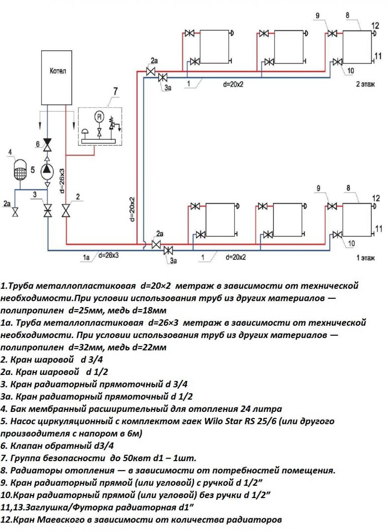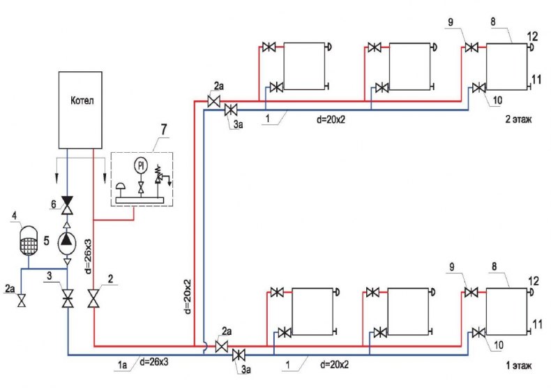 Такая схема чаще всего делается замкнутой, с использованием герметичного расширительного бака. Давление в системе создается с помощью циркуляционного насоса. Если нужно обогреть двухэтажный частный дом, прокладываем трубы на верхнем и нижнем этажах, после чего создаем параллельное подключение обоих этажей к отопительному котлу.