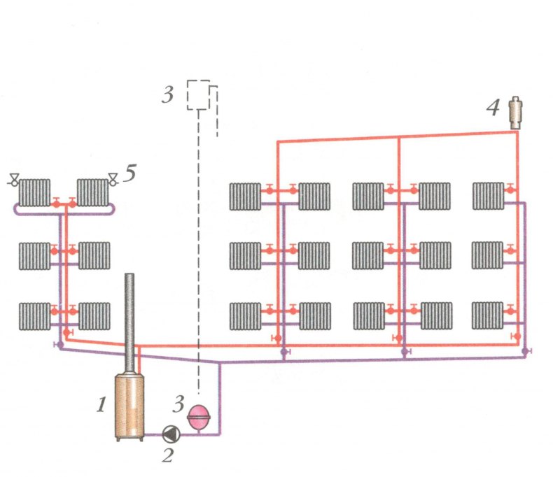 Для чего нужна такая схема? Она оптимальна в многоэтажных домах с большим количеством радиаторов. Благодаря этому достигается более равномерный прогрев, пропадает необходимость установки большого количества воздушных спускников – воздух будет удаляться через расширительный бак или через отдельный спускник, входящий в состав группы безопасности.