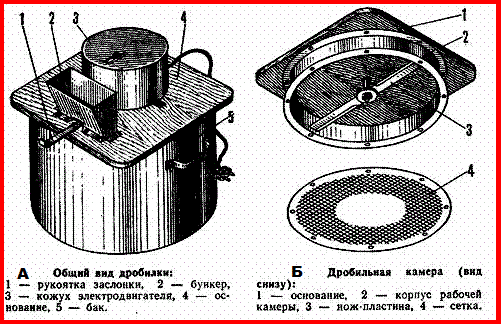 Конструкция измельчителя представляет собой терку, которая устанавливается на вал. Движение барабана на валу происходит с помощью двигателя через редуктор, который сокращает число оборотов.