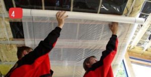 Монтаж пароизоляции мембранного типа достаточно удобен и не требует высокой квалификации. Из инструментов достаточно иметь строительный нож и степлер. Предварительно раскроенный материал закрепляется на обрешётке скобами.